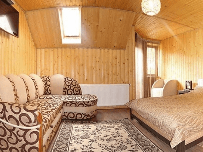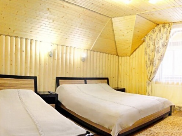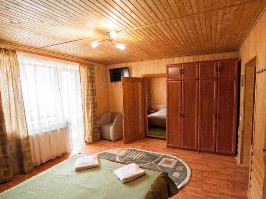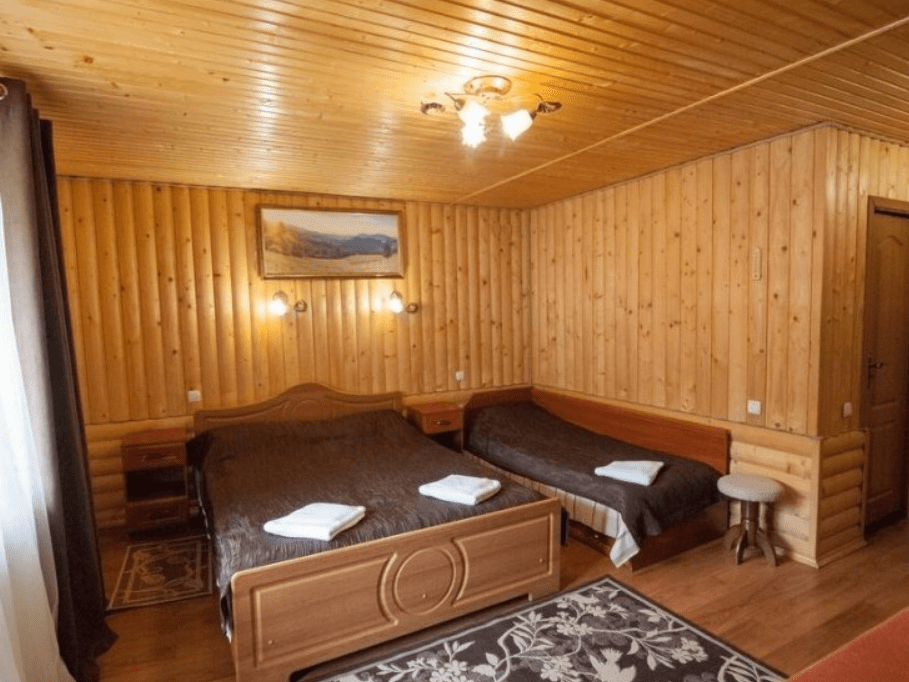 Просторный однокомнатный номер общей площадью 30 кв.м. рассчитан на трехместное размещение. Номер оборудован двухспальной кроватью, односпальной кроватью, прикроватными тумбами, телевизором со спутниковым ТВ, комодом, шкафом для одежды. В номере есть выход на балкон с прекрасным видом на горы. Санузел оснащен душевой кабинкой с круглосуточной подачей холодной и горячей воды, пол с подогревом.