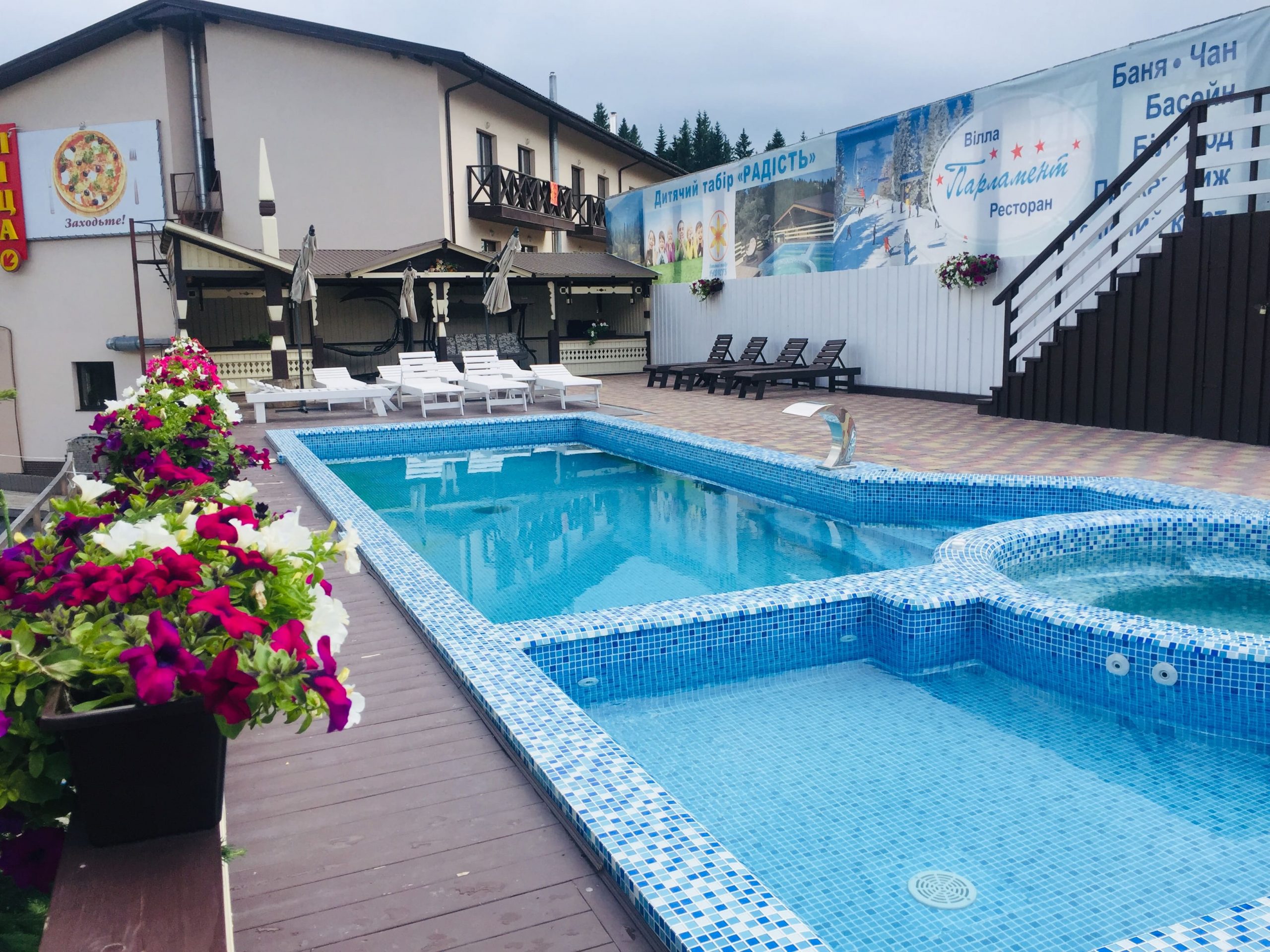 – современный гостиничный комплекс, который имеет: 3 корпуса, коттедж, ресторан, бильярд, баню, пункт проката снаряжения, открытый бассейн для взрослых и маленьких детей с подогревом, джакузи, баскетбольное, футбольное, волейбольное поле. На территории виллы «Парламент» растут столетние огромные ели и красавицы – лиственницы с милейшими обитателями – черными карпатскими белками. Обустроенная территория с обширной зоной отдыха, на которой расположены барбекю и беседки, доброжелательный персонал и впечатляющие горные пейзажи (Яблуница расположена на территории Карпатского национального природного парка), чистейший горный воздух и тишина – у нас есть все для того, чтобы создать идеальные условия для вашего отдыха и возобновления  души и тела!