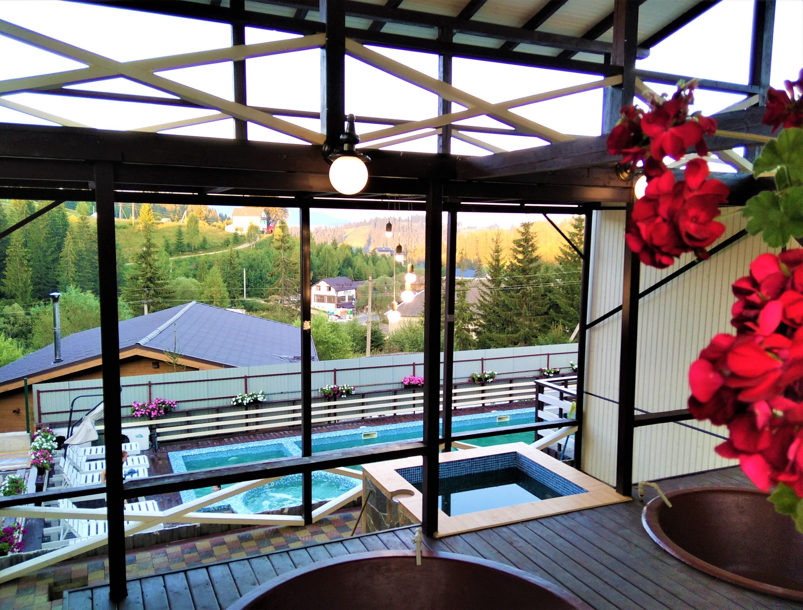 Отдых в Карпатах это не только горнолыжные спуски и покорение вершин, но еще и отдых у собственного бассейна виллы «Парламент».
